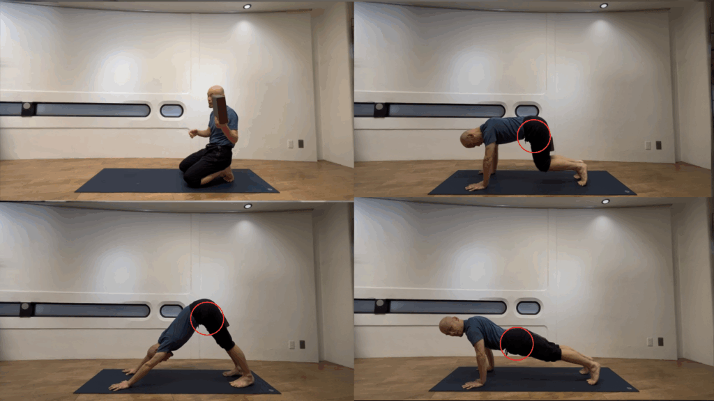 ① 騎手 のポーズ→ ダウンドッグ:股関節の“受け渡し”